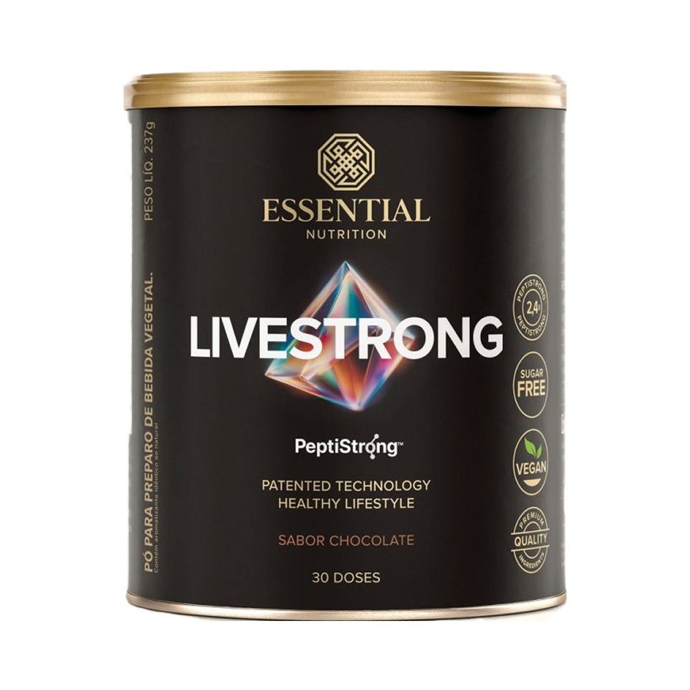 LiveStrong é uma fórmula prática e inovadora que combina o sabor marcante do puro cacau com PeptiStrong™ — proteína hidrolisada da fava, cuidadosamente selecionada com o apoio da inteligência artificial, a partir de uma ampla e avançada base de dados científicos dedicada a ingredientes derivados de plantas.