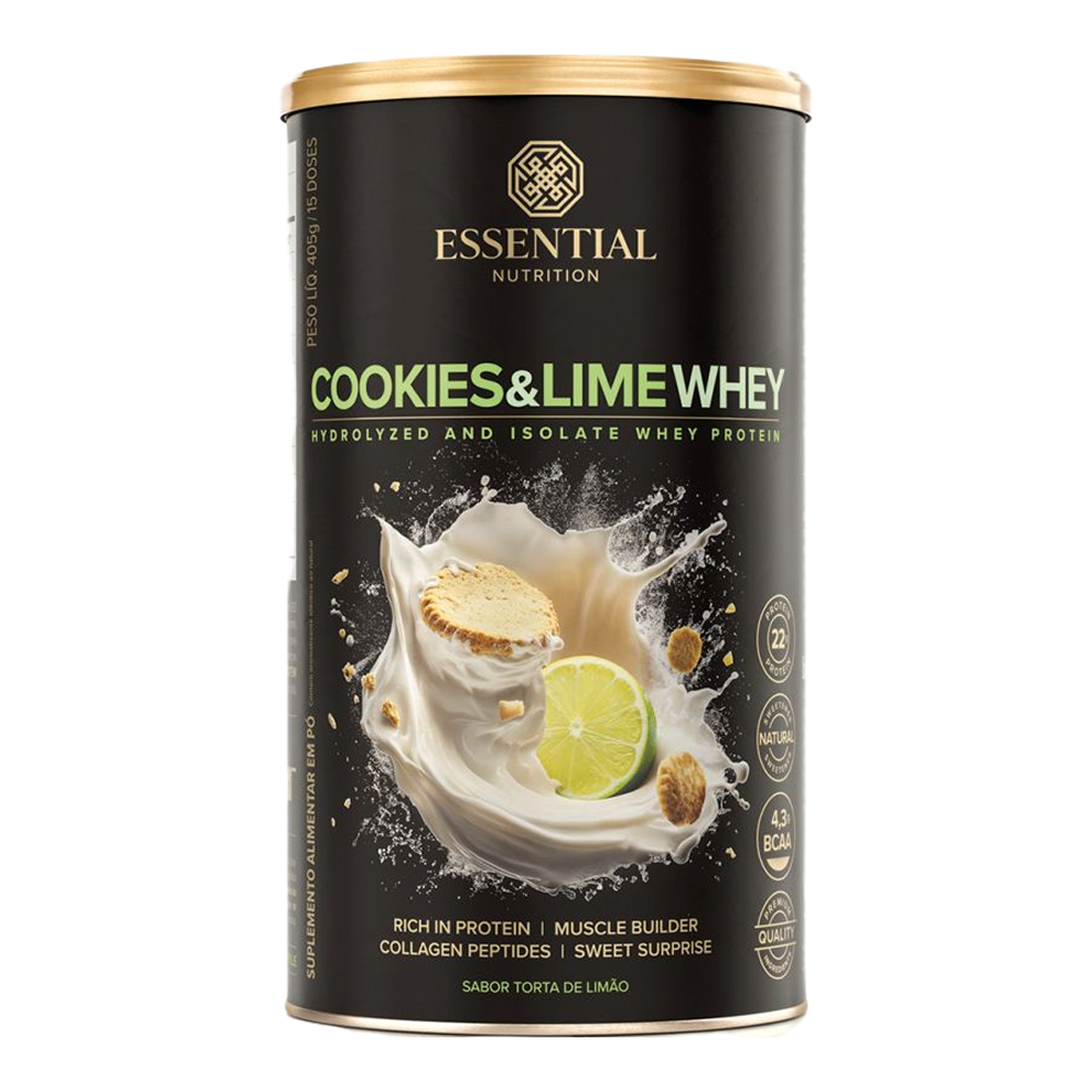 O Whey Protein Cookies & Lime da Essential Nutrition combina whey protein hidrolisado e isolado com colágeno em peptídeos, oferecendo um sabor surpreendente, equilibrado e irresistível.